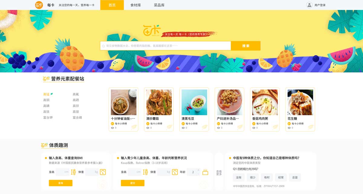 每卡网是北京凯禾瑞华科技有限公司自主研发的一款面向健康饮食的营养配餐网络化产品,根据不同用户进行科学营养膳食搭配。涉及营养学、计算机学、医学等多方面内容,以解决菜谱中营养成分的计算、加工、营养损耗、配餐对象的饮食习惯等问题。
